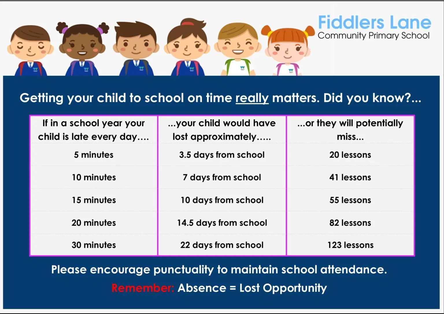 When pupils are late, even by 2 minutes, they miss essential learning and instructions given out at the start of their lesson. This can significantly reduce achievement, regardless of